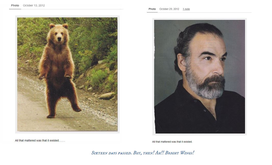Categories Actors animal photography Animals Epoch-Defining Moments Fugue States Internal Thematic Reverberations It Exists Mandy Patinkin Meta Photography Preternatural Calm Subdued Bears Visionary Visions All That Mattered….. Post author By ml22 Post date August 7, 2019 No Comments on All That Mattered….. Sixteen days passed. Then! Ah! Bright wings. Share this: Click to share on X (Opens in new window) X Click to share on Facebook (Opens in new window) Facebook Like Loading... Related Tags bears who are in fugue states, displeased actors, It Exists, Mandy Patinkin, Meta, short-lived epics, subdued individuals, the new way of things, thematic unity By ml22 β°.β. View Archive → ← The Maltese Falcon {1941}. → πβπ ππ’ππ πππ ππππππππππ‘. Leave a comment Cancel reply Δ